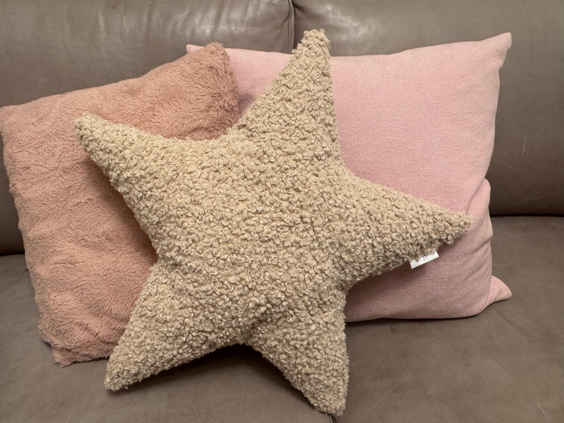 Der Stern wurde aus Teddy Boucle genäht, gefüllt ist er mit einem Füllmaterial aus High-Tech silikonisierte Hohlfaser.